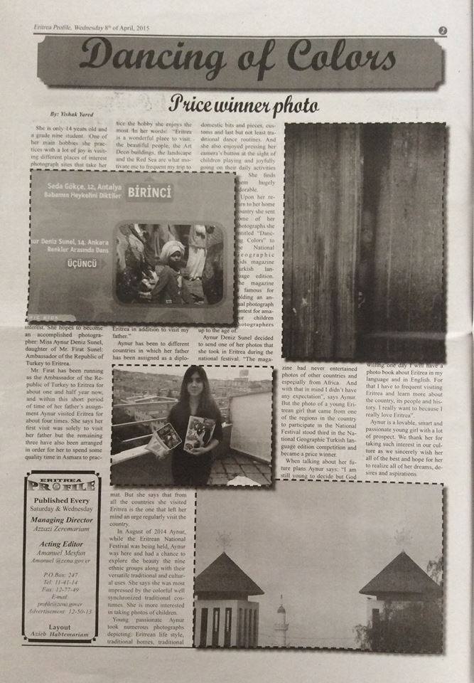 National Geographic Kids/Türkiye dergisi tarafından 2014 yılında düzenlenen fotoğraf yarışmasında 14 yaşındaki Aynur Deniz Sunel’in Eritre'yi anlatan bir fotoğrafla dereceye girmesine ilişkin Eritre Enformasyon Bakanlığı'nın resmi sayfasında yayınlanan açıklamanın metnine aşağıdaki internet adresinden erişim mümkündür.